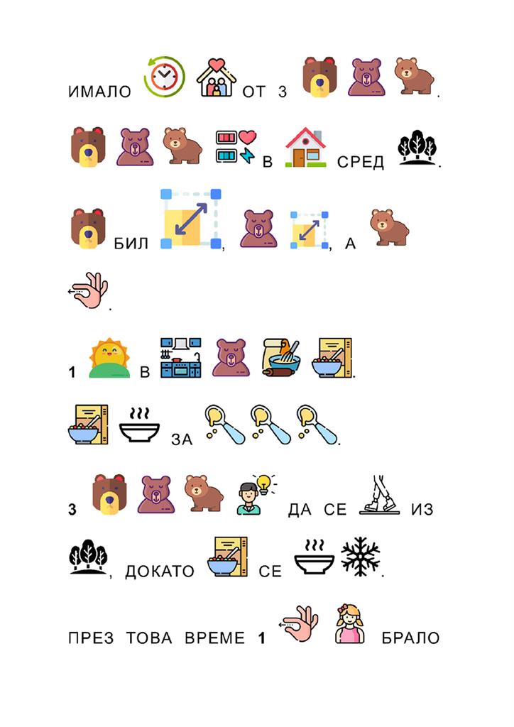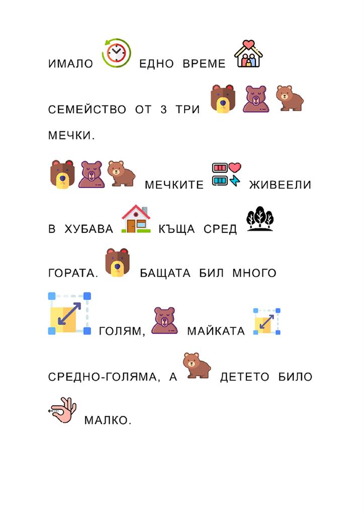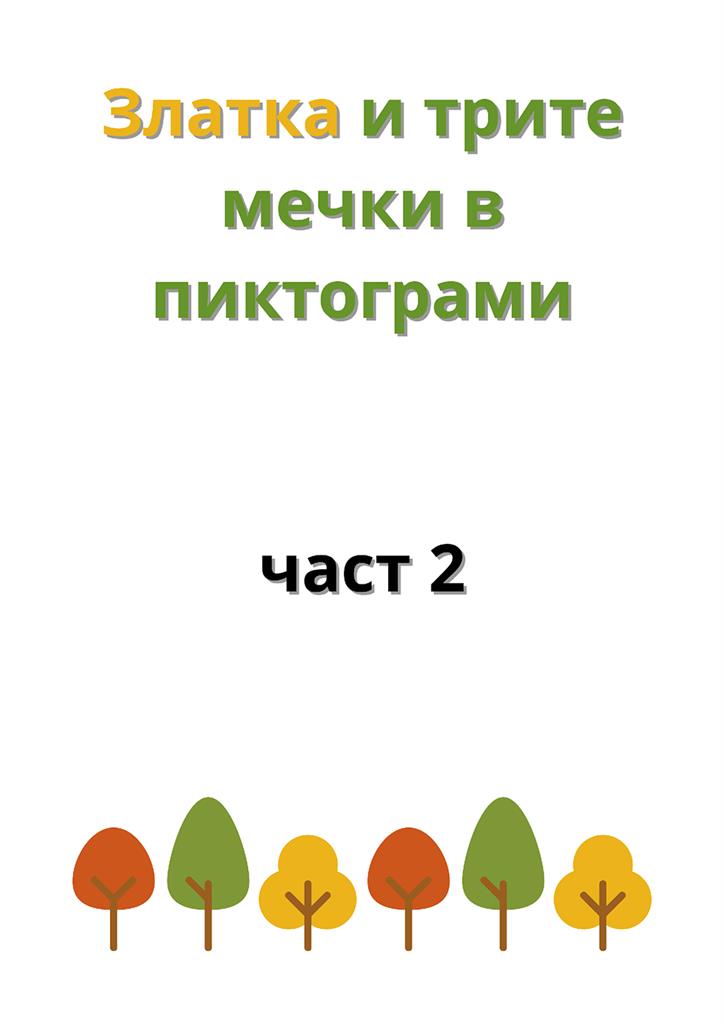 „Златка и трите мечки в пиктограми“ е книга от три части. В първата част е представена приказката с пиктограмите и целият текст. В тази част родителите или учителите запознават детето със съдържанието на историята и значението на пиктограмите. Втората част е създадена от пиктограми и малко на брой свързващи думи. Това е вариантът, който детето може да разглежда и използва само. Третата част се състои от текст, в който само някои думи са заменени с пиктограми. В книгата ще намерите и легенда на пиктограмите.