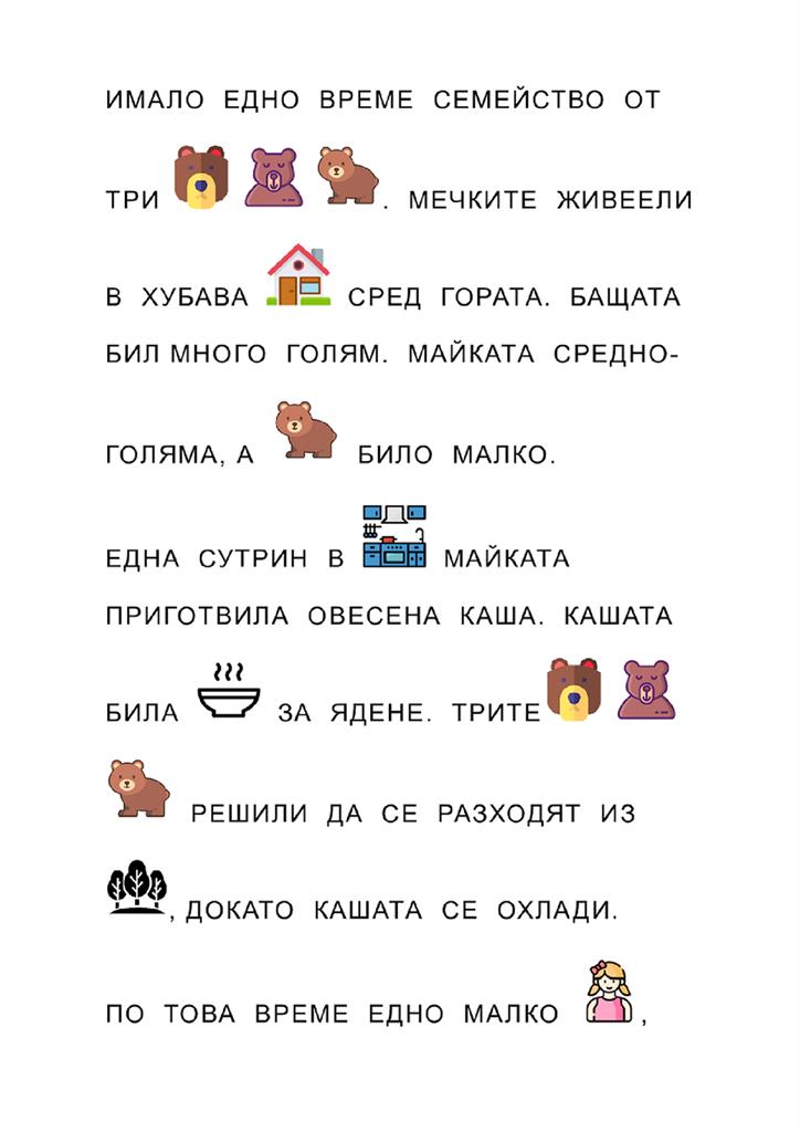 „Златка и трите мечки в пиктограми“ е втората книга от поредицата с адаптирани книги, които децата могат да четат сами още от ранна детска възраст. Книгата е написана с шрифт и разредка на текста, което улеснява четенето. Пиктограмите помагат за разбиране на думите и концентрацията на вниманието. Те са конкретни графични символи, които могат да изобразяват обекти и действия. Елементарни рисунки, които предават съобщение, без да са необходими допълнителни думи и пояснителни текстове.