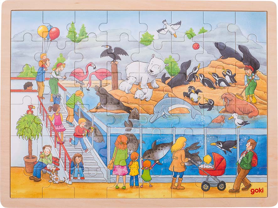 Пъзел в дървена рамка на тема „Посещение в зоологическата градина“. Съдържание: 48 елемента Материал: дърво Размери: 40х30х0,8 см