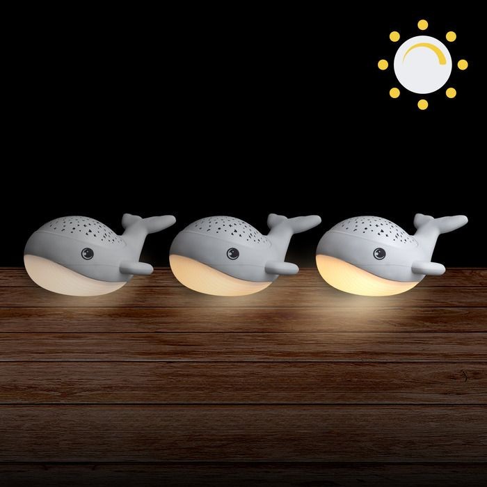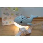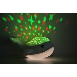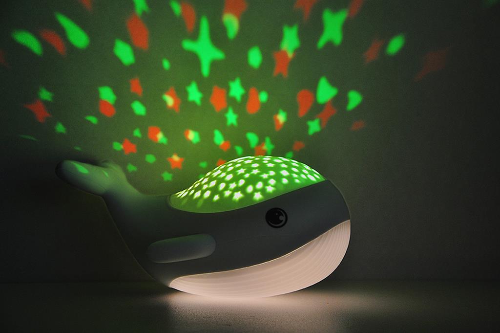 На коремчето си, лампата излъчва топла бяла светлина с димираща функция, която създава уютна атмосфера за приспиване, четене или нощно кърмене. На гърба си, китът прожектира красиви звезди в червено, зелено, синьо или в плавен цветен преход. Проекторът се изключва автоматично след 30 минути, за да пести енергия.